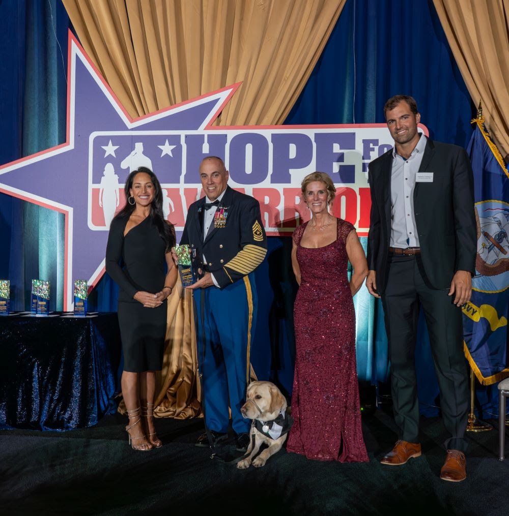(Left to right): FOX News host Emily Compagno, retired U.S. Army Sgt. Maj. Kevin Bittenbender and Kirby accepting the Hope For The Warriors Kirby Distinguished Service Paw Award, alongside Hope For The Warriors founder and CEO Robin Kelleher and U.S. Army veteran and former NFL player Alejandro Villanueva.